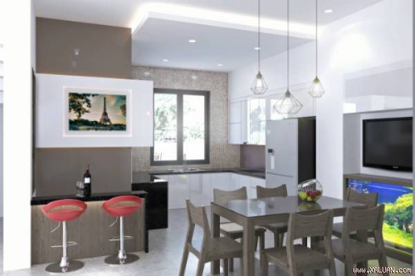 Yêu cầu của chủ nhà cần có căn bếp hiện đại bao gồm bàn ăn có bố trí được TV, bể cá cảnh và quầy bar nhỏ. Ngăn giữa tủ bếp và khu vực kệ TV là hộp kỹ thuật, vì thế, tôi đã lấp đi phần trên tủ bếp và tủ kệ TV bằng hộp thạch cao rỗng, khiến cho toàn bộ bức tường chứa tủ bếp và kệ TV trở nên phẳng phiu là đơn giản đến tối thiểu.
